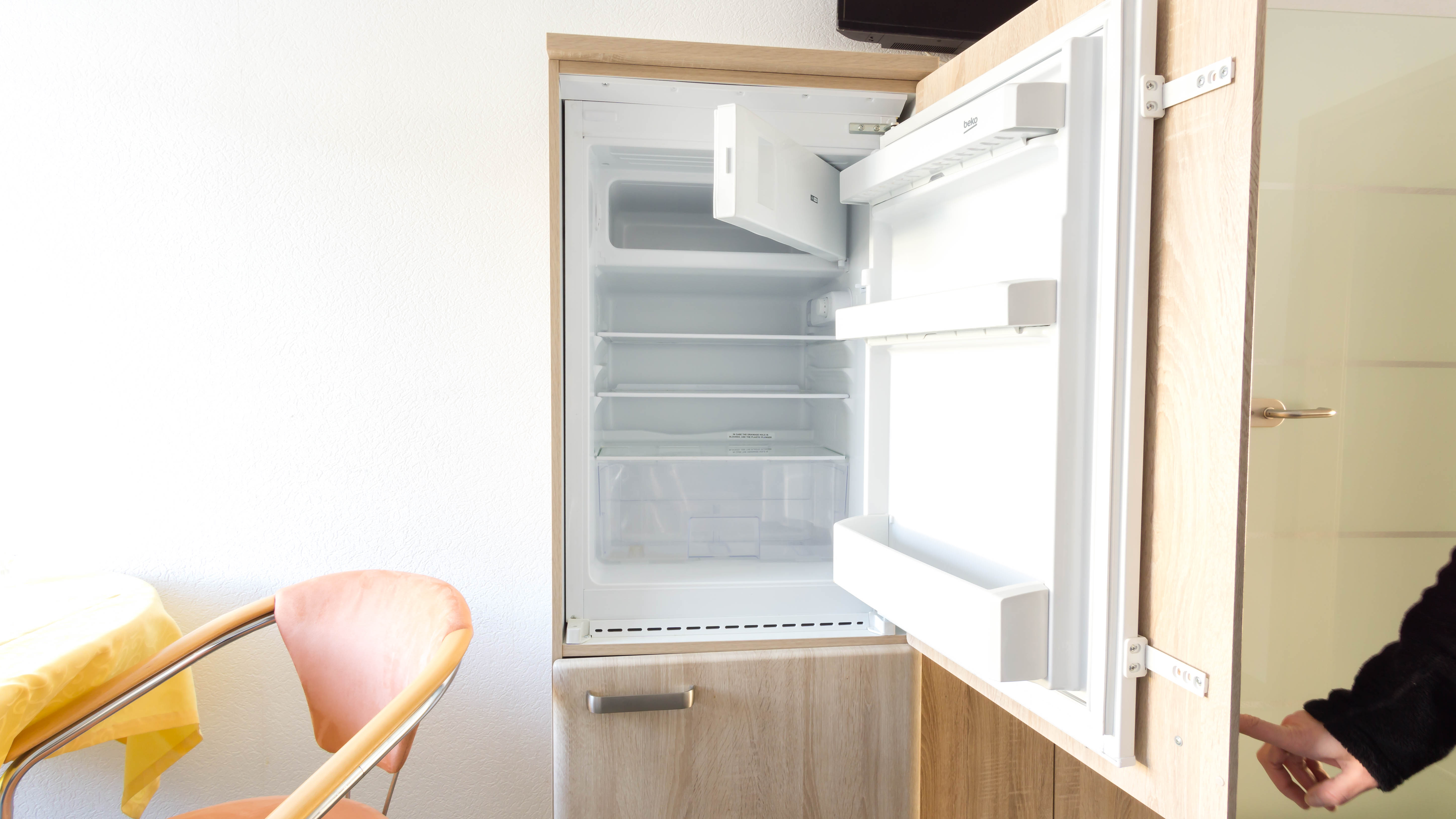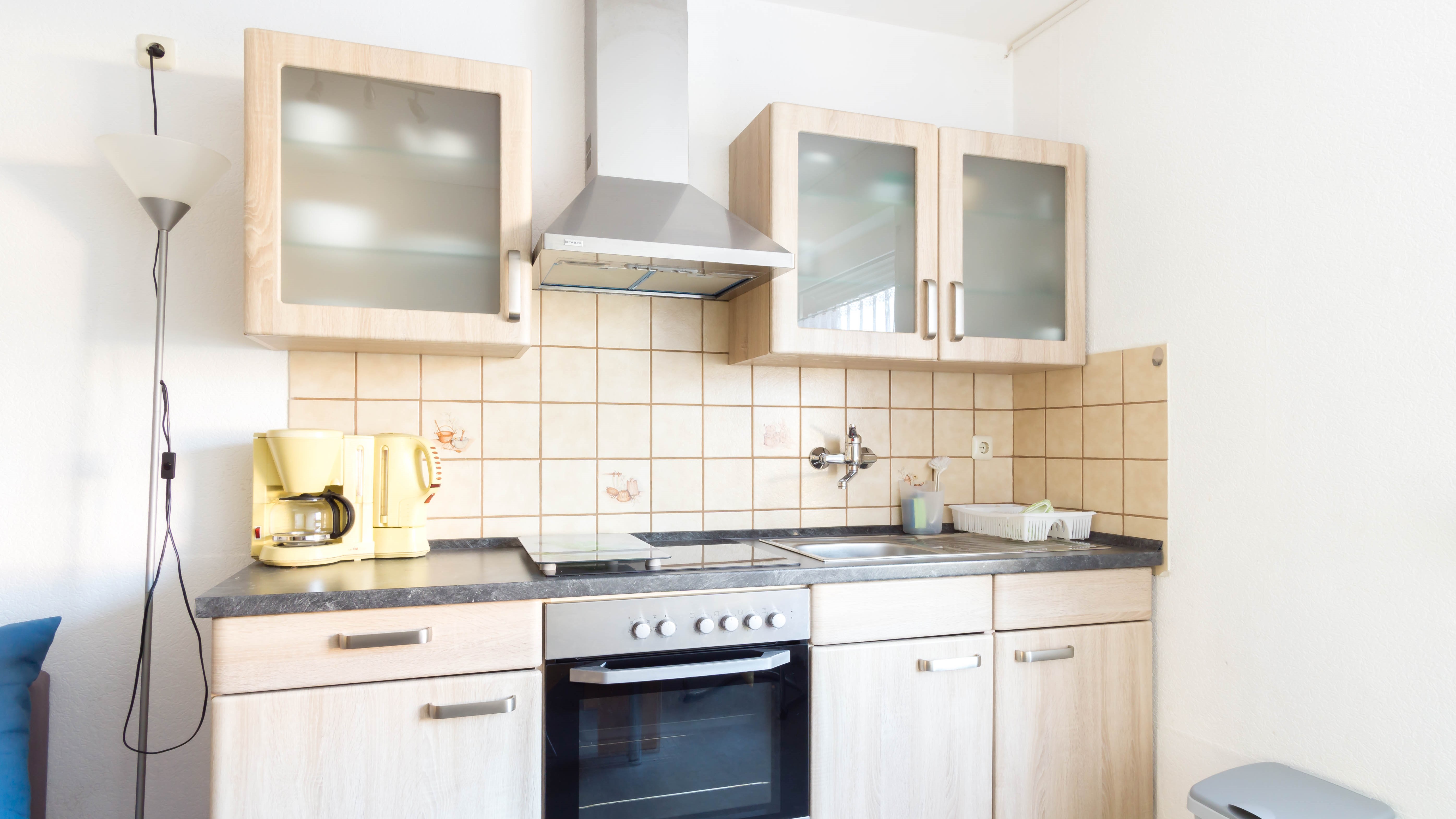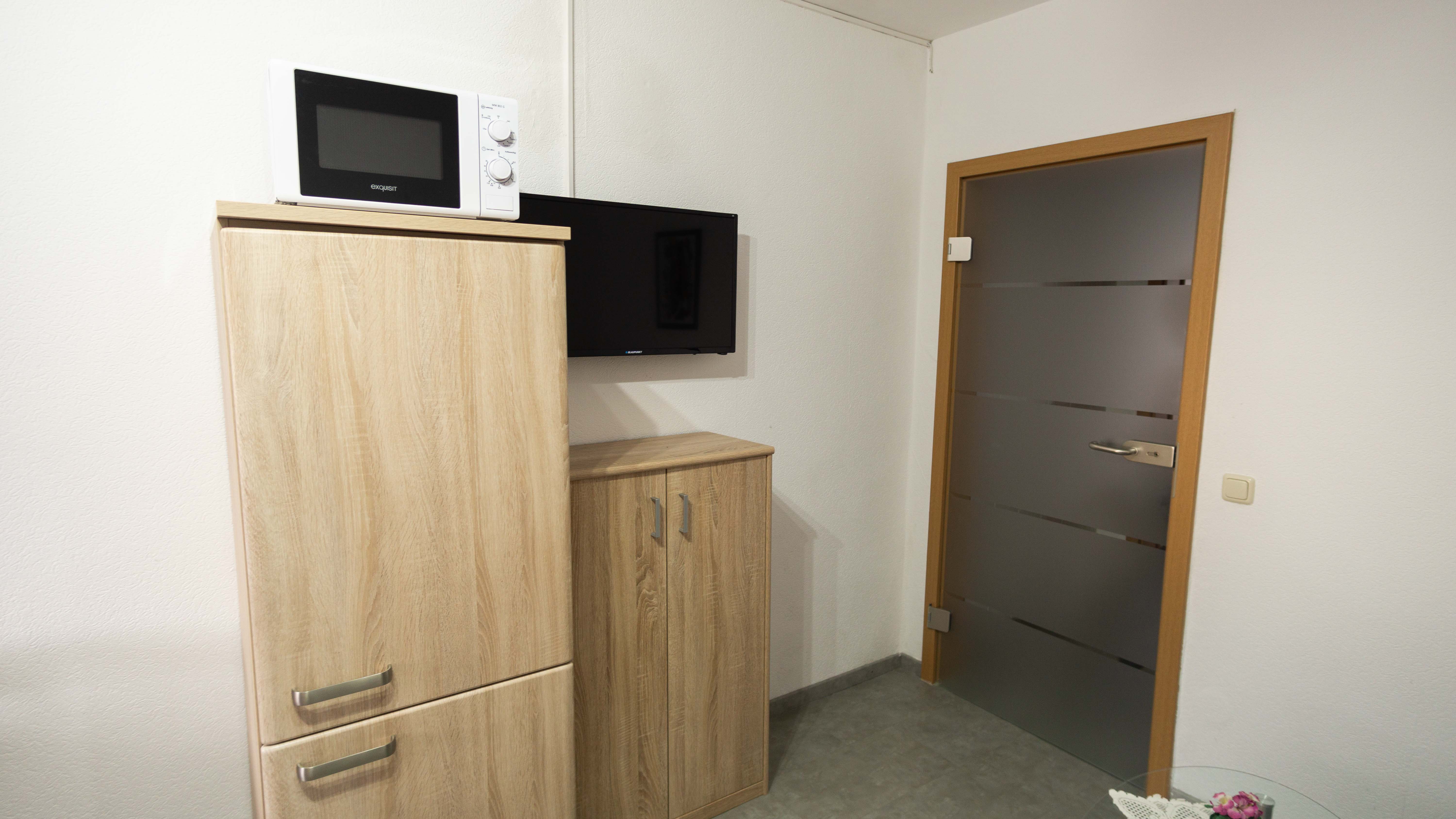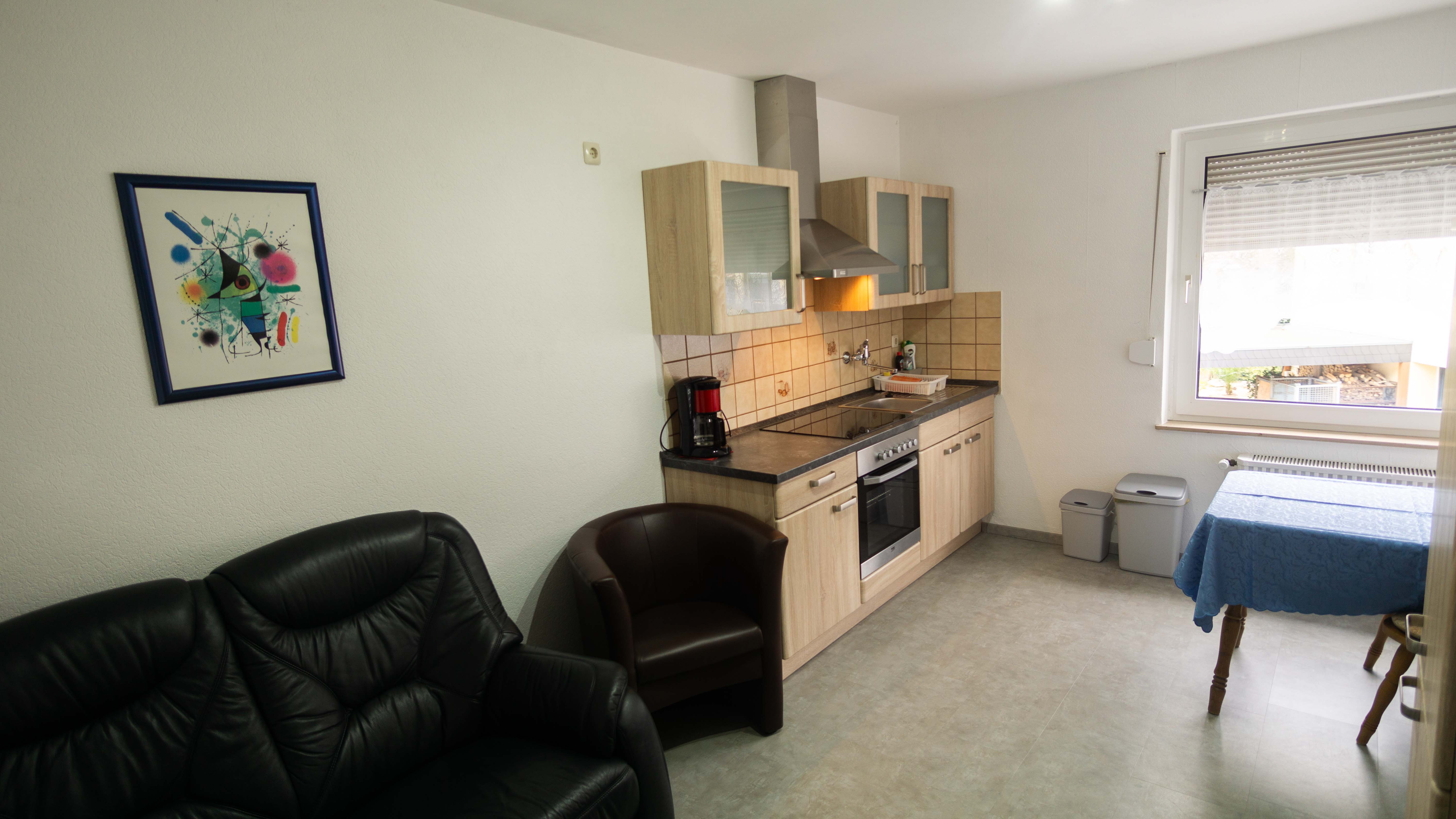 Die etwa 30m² große Wohnung befindet sich im ersten Stockwerk und kann über ein Treppenhaus erreicht werden. Ausgestattet ist die Wohnung mit einer Wohnküche mit Elektroherd, Cerankochfeld, Mikrowelle und einen Kühlschrank mit Gefrierfach. In der Wohnküche befindet sich ein Sofa und ein Sessel. Das Badezimmer grenzt am Schlafzimmer an und verfügt über eine Dusche und WC.